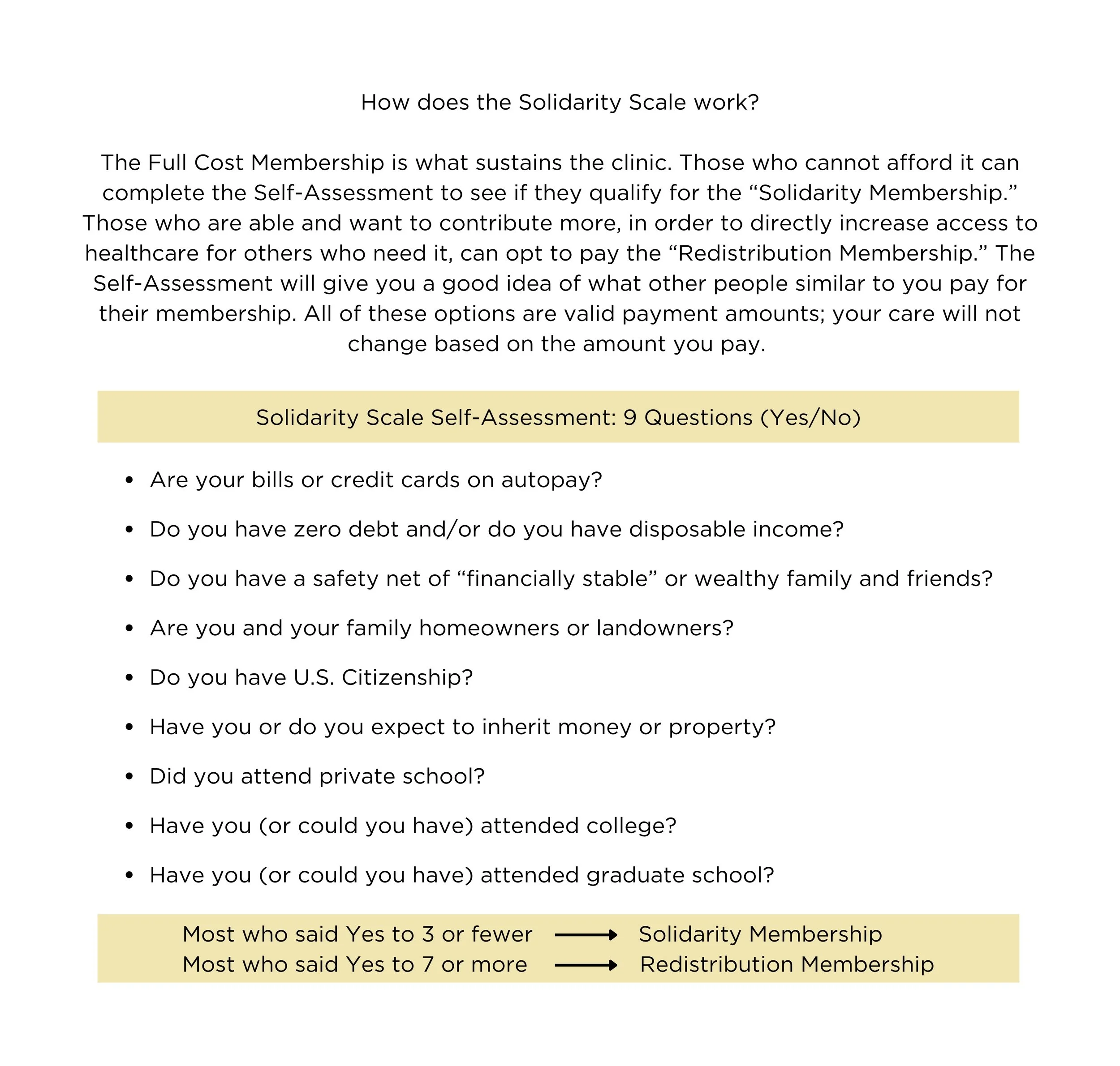 To reflect the clinic’s operations and better meet the needs of the communities that we serve, we are moving from an age-based membership price to ONE flat monthly fee, called the “Full Cost” membership, with discounts available for multiple people on the same method of payment. We’re also introducing a Solidarity Scale, details below.